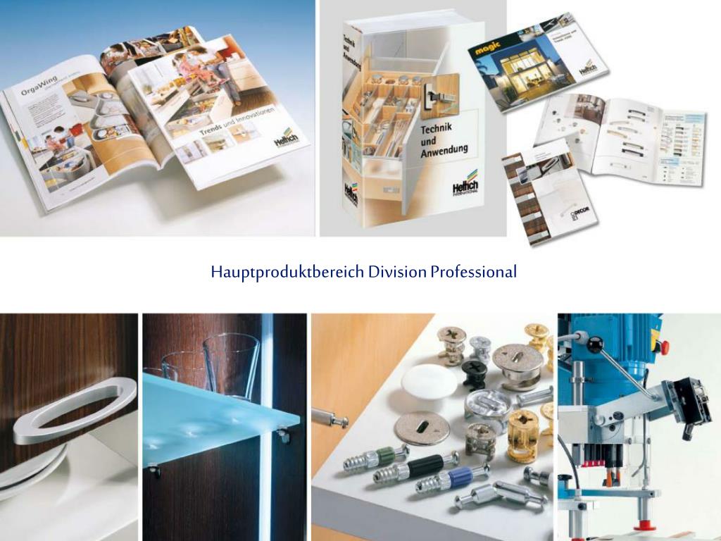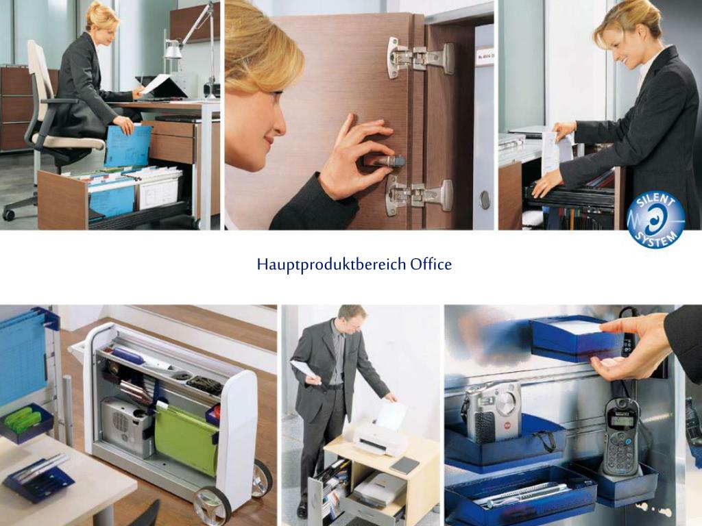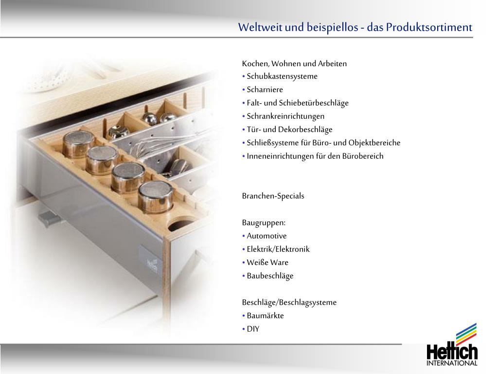 Weltweit und beispiellos - das Produktsortiment • Kochen, Wohnen und Arbeiten • Schubkastensysteme • Scharniere • Falt- und Schiebetürbeschläge • Schrankreinrichtungen • Tür- und Dekorbeschläge • Schließsysteme für Büro- und Objektbereiche • Inneneinrichtungen für den BürobereichBranchen-SpecialsBaugruppen: • Automotive • Elektrik/Elektronik • Weiße Ware • BaubeschlägeBeschläge/Beschlagsysteme • Baumärkte • DIY
