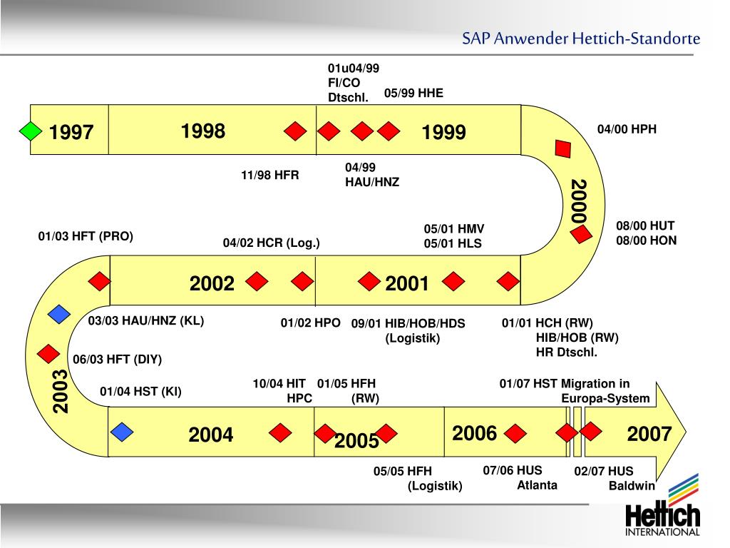 SAP Anwender Hettich-Standorte 01u04/99 FI/CO Dtschl. 05/99 HHE 1998 1997 1999 04/00 HPH 04/99 HAU/HNZ 11/98 HFR 2000 08/00 HUT 08/00 HON 05/01 HMV 05/01 HLS 01/03 HFT (PRO) 04/02 HCR (Log.) 2002 2001 03/03 HAU/HNZ (KL) 01/02 HPO 01/01 HCH (RW) HIB/HOB (RW) HR Dtschl. 09/01 HIB/HOB/HDS (Logistik) 06/03 HFT (DIY) 10/04 HIT HPC 01/05 HFH (RW) 01/07 HST Migration in Europa-System 2003 01/04 HST (Kl) 2006 2007 2004 2005 07/06 HUS Atlanta 05/05 HFH (Logistik) 02/07 HUS Baldwin
