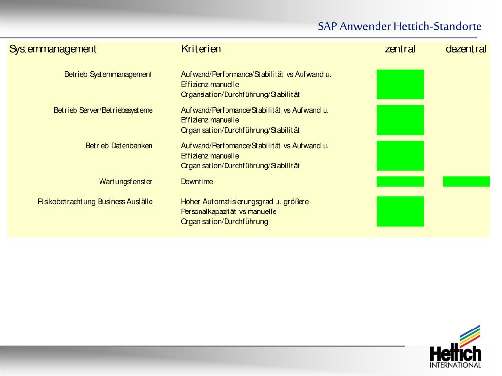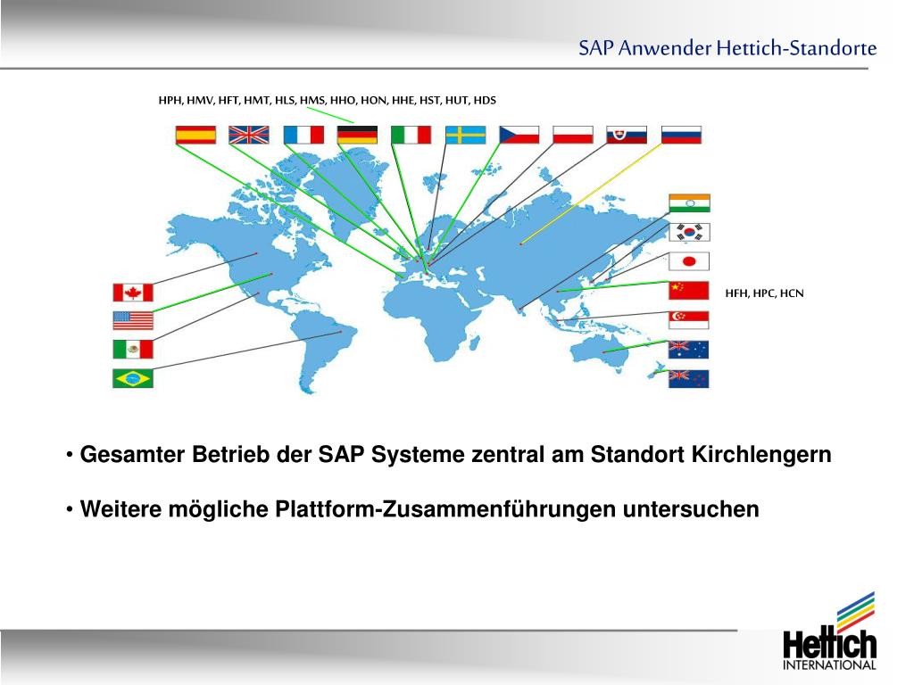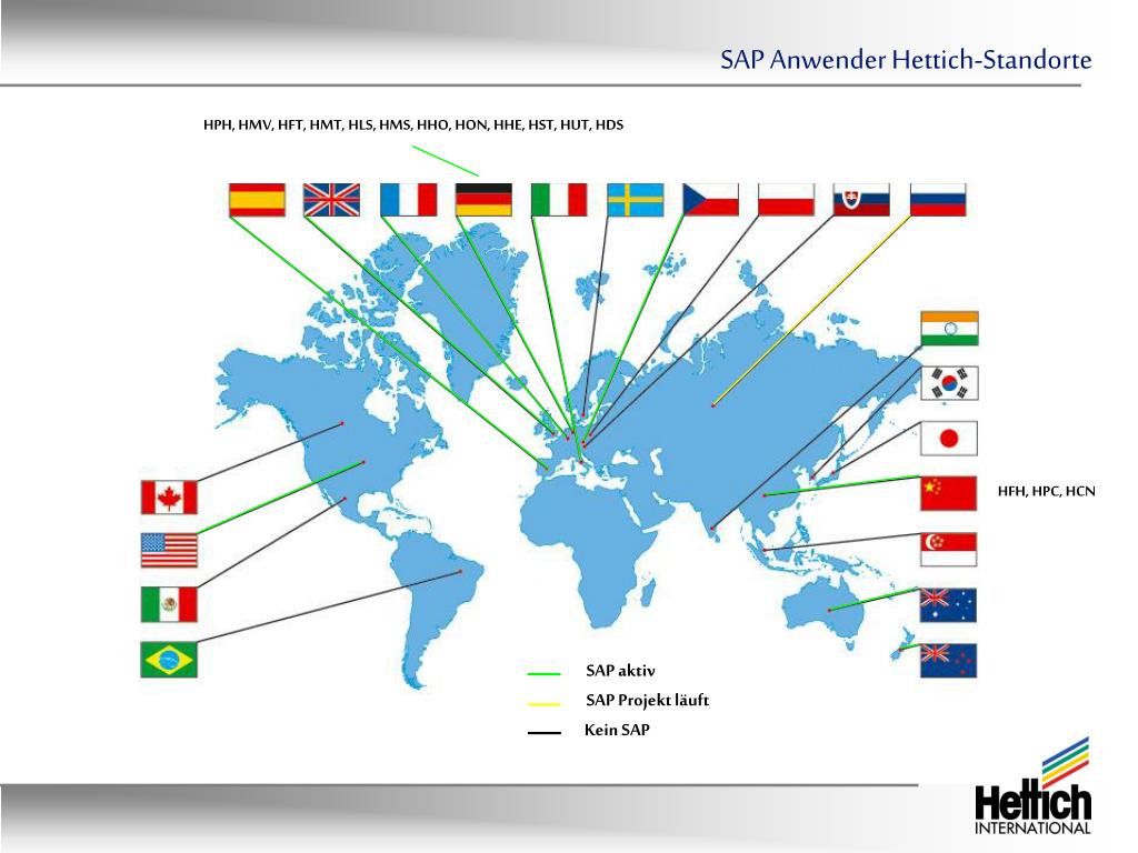 SAP Anwender Hettich-Standorte HPH, HMV, HFT, HMT, HLS, HMS, HHO, HON, HHE, HST, HUT, HDS HFH, HPC, HCN SAP aktiv SAP Projekt läuft Kein SAP