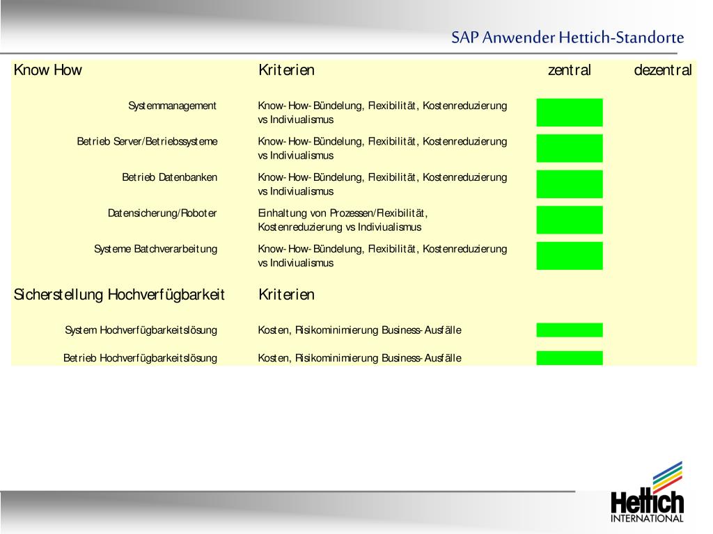 HPH, HMV, HFT, HMT, HLS, HMS, HHO, HON, HHE, HST, HUT, HDS HFH, HPC, HCN SAP Anwender Hettich-Standorte • Gesamter Betrieb der SAP Systeme zentral am Standort Kirchlengern • Weitere mögliche Plattform-Zusammenführungen untersuchen