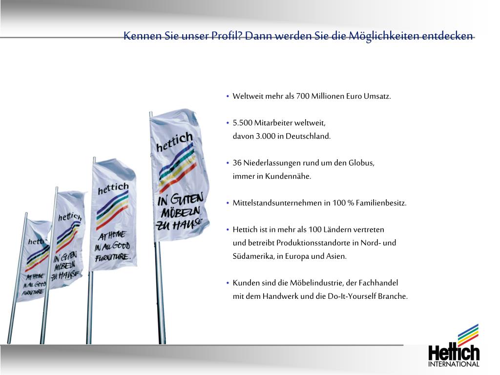 Kennen Sie unser Profil? Dann werden Sie die Möglichkeiten entdecken • Weltweit mehr als 700 Millionen Euro Umsatz. • 5.500 Mitarbeiter weltweit, davon 3.000 in Deutschland. • 36 Niederlassungen rund um den Globus, immer in Kundennähe. • Mittelstandsunternehmen in 100 % Familienbesitz. • Hettich ist in mehr als 100 Ländern vertreten und betreibt Produktionsstandorte in Nord- und Südamerika, in Europa und Asien. • Kunden sind die Möbelindustrie, der Fachhandel mit dem Handwerk und die Do-It-Yourself Branche.