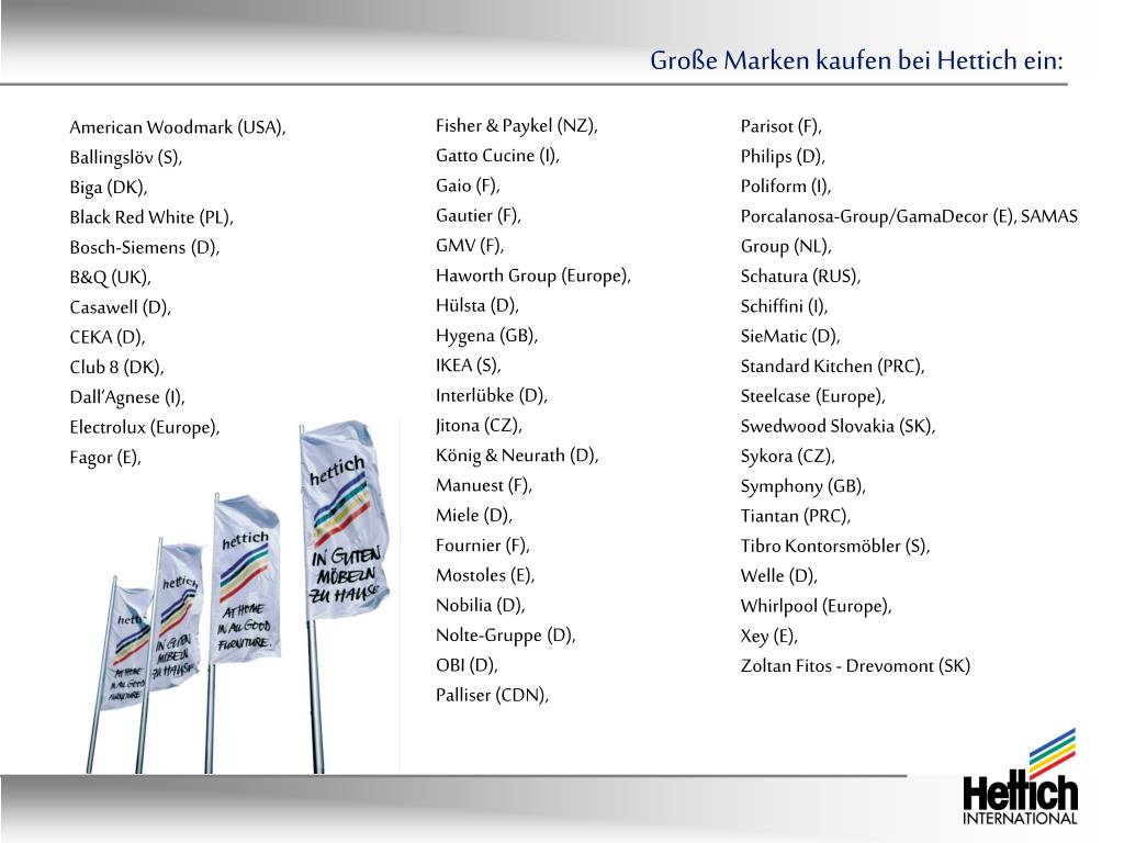 Große Marken kaufen bei Hettich ein: Parisot (F),Philips (D), Poliform (I), Porcalanosa-Group/GamaDecor (E), SAMAS Group (NL), Schatura (RUS), Schiffini (I), SieMatic (D), Standard Kitchen (PRC), Steelcase (Europe), Swedwood Slovakia (SK), Sykora (CZ), Symphony (GB), Tiantan (PRC), Tibro Kontorsmöbler (S), Welle (D), Whirlpool (Europe),Xey (E), Zoltan Fitos - Drevomont (SK) American Woodmark (USA), Ballingslöv (S), Biga (DK),Black Red White (PL), Bosch-Siemens (D), B&Q (UK), Casawell (D), CEKA (D), Club 8 (DK), Dall‘Agnese (I), Electrolux (Europe), Fagor (E), Fisher & Paykel (NZ), Gatto Cucine (I), Gaio (F), Gautier (F), GMV (F), Haworth Group (Europe), Hülsta (D), Hygena (GB), IKEA (S), Interlübke (D), Jitona (CZ), König & Neurath (D), Manuest (F), Miele (D), Fournier (F), Mostoles (E), Nobilia (D), Nolte-Gruppe (D), OBI (D), Palliser (CDN),