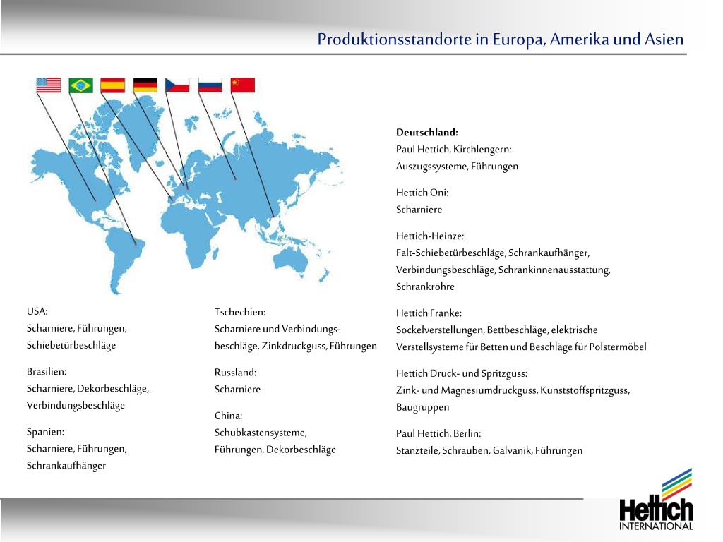 Produktionsstandorte in Europa, Amerika und Asien Deutschland: Paul Hettich, Kirchlengern: Auszugssysteme, Führungen Hettich Oni: Scharniere Hettich-Heinze: Falt-Schiebetürbeschläge, Schrankaufhänger, Verbindungsbeschläge, Schrankinnenausstattung, SchrankrohreHettich Franke: Sockelverstellungen, Bettbeschläge, elektrische Verstellsysteme für Betten und Beschläge für Polstermöbel Hettich Druck- und Spritzguss:Zink- und Magnesiumdruckguss, Kunststoffspritzguss, Baugruppen Paul Hettich, Berlin: Stanzteile, Schrauben, Galvanik, Führungen USA: Scharniere, Führungen, SchiebetürbeschlägeBrasilien: Scharniere, Dekorbeschläge, Verbindungsbeschläge Spanien: Scharniere, Führungen, Schrankaufhänger Tschechien: Scharniere und Verbindungs-beschläge, Zinkdruckguss, Führungen Russland: ScharniereChina: Schubkastensysteme, Führungen, Dekorbeschläge