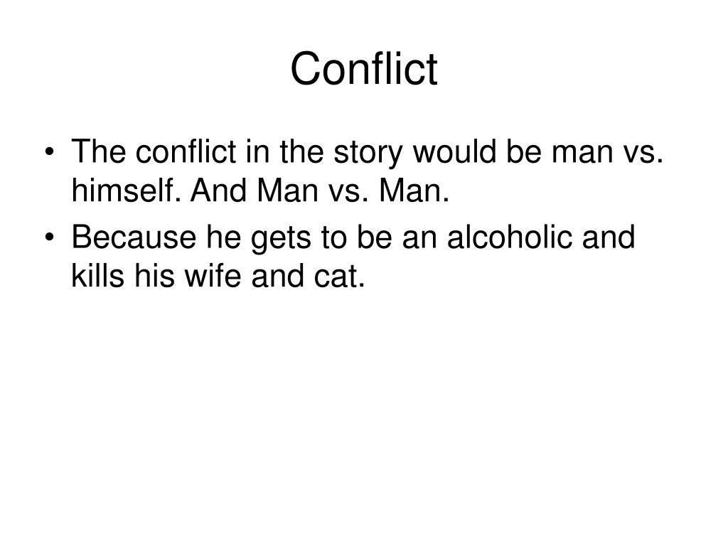 Conflict • The conflict in the story would be man vs. himself. And Man vs. Man. • Because he gets to be an alcoholic and kills his wife and cat.