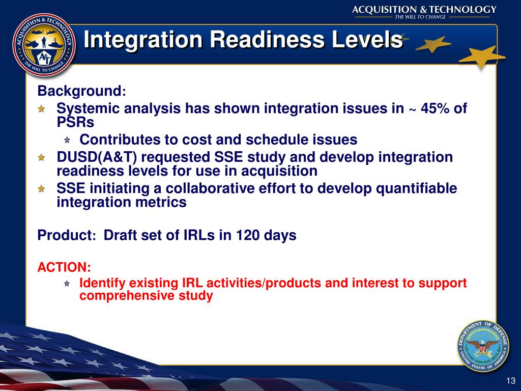 Integration Readiness Levels Background: • Systemic analysis has shown integration issues in ~ 45% of PSRs • Contributes to cost and schedule issues • DUSD(A&T) requested SSE study and develop integration readiness levels for use in acquisition • SSE initiating a collaborative effort to develop quantifiable integration metrics Product: Draft set of IRLs in 120 days ACTION: • Identify existing IRL activities/products and interest to support comprehensive study