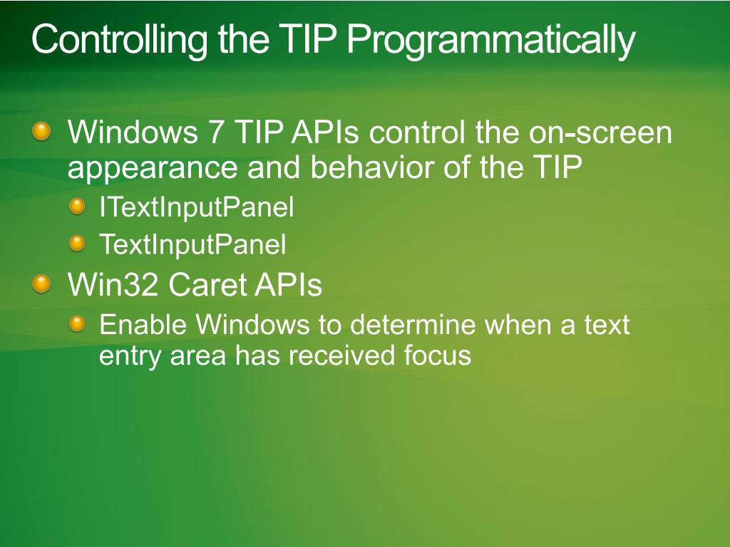 Controlling the TIP Programmatically • Windows 7 TIP APIs control the on-screen appearance and behavior of the TIP • ITextInputPanel • TextInputPanel • Win32 Caret APIs • Enable Windows to determine when a text entry area has received focus