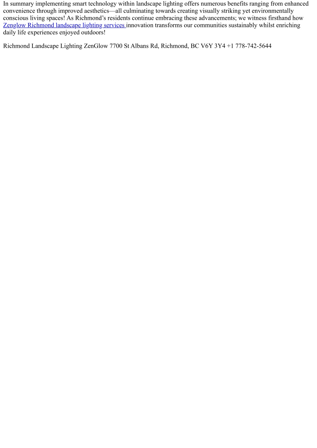 In summary implementing smart technology within landscape lighting offers numerous benefits ranging from enhanced convenience through improved aesthetics—all culminating towards creating visually striking yet environmentally conscious living spaces! As Richmond’s residents continue embracing these advancements; we witness firsthand how Zenglow Richmond landscape lighting services innovation transforms our communities sustainably whilst enriching daily life experiences enjoyed outdoors! Richmond Landscape Lighting ZenGlow 7700 St Albans Rd, Richmond, BC V6Y 3Y4 +1 778-742-5644