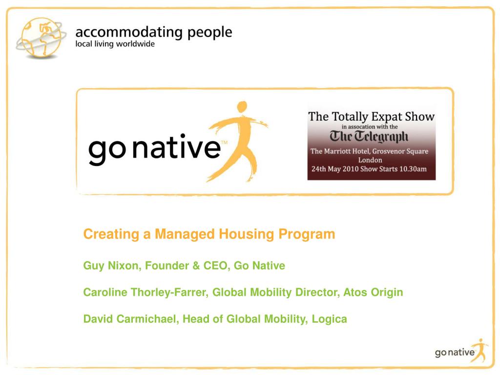Creating a Managed Housing Program Guy Nixon, Founder & CEO, Go Native Caroline Thorley-Farrer, Global Mobility Director, Atos Origin David Carmichael, Head of Global Mobility, Logica