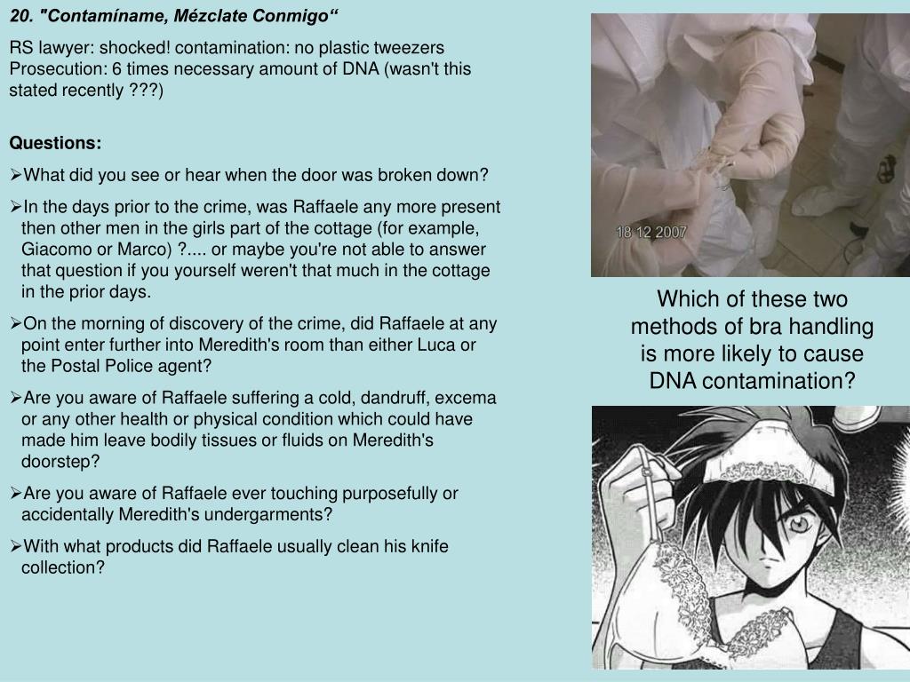 20. "Contamíname, Mézclate Conmigo“ • RS lawyer: shocked! contamination: no plastic tweezersProsecution: 6 times necessary amount of DNA (wasn't this stated recently ???) • Questions: • What did you see or hear when the door was broken down? • In the days prior to the crime, was Raffaele any more present then other men in the girls part of the cottage (for example, Giacomo or Marco) ?.... or maybe you're not able to answer that question if you yourself weren't that much in the cottage in the prior days. • On the morning of discovery of the crime, did Raffaele at any point enter further into Meredith's room than either Luca or the Postal Police agent? • Are you aware of Raffaele suffering a cold, dandruff, excema or any other health or physical condition which could have made him leave bodily tissues or fluids on Meredith's doorstep? • Are you aware of Raffaele ever touching purposefully or accidentally Meredith's undergarments? • With what products did Raffaele usually clean his knife collection? Which of these two methods of bra handling is more likely to cause DNA contamination?