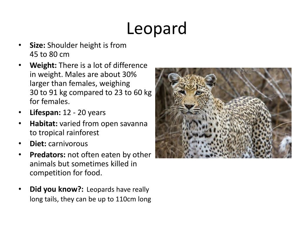 Leopard • Size: Shoulder height is from 45 to 80 cm • Weight: There is a lot of difference in weight. Males are about 30% larger than females, weighing 30 to 91 kg compared to 23 to 60 kg for females. • Lifespan: 12 - 20 years • Habitat: varied from open savanna to tropical rainforest • Diet: carnivorous • Predators: not often eaten by other animals but sometimes killed in competition for food. • Did you know?:Leopards have really long tails, they can be up to 110cm long