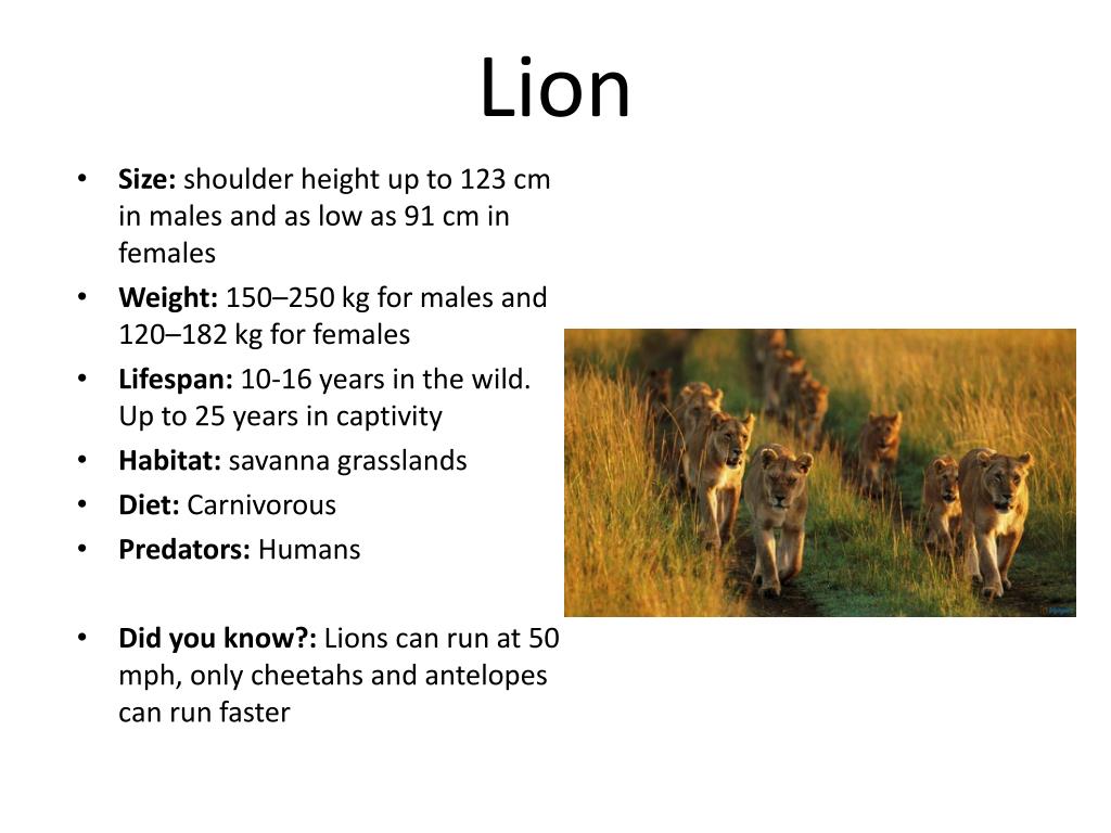 Lion • Size: shoulder height up to 123 cm in males and as low as 91 cm in females • Weight: 150–250 kg for males and 120–182 kg for females • Lifespan: 10-16 years in the wild. Up to 25 years in captivity • Habitat: savanna grasslands • Diet: Carnivorous • Predators: Humans • Did you know?: Lions can run at 50 mph, only cheetahs and antelopes can run faster