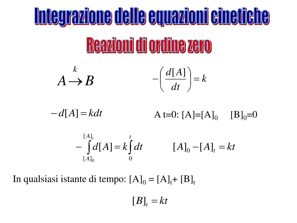 Integrazione delle equazioni cinetiche Reazioni di ordine zero A t=0: [A]=[A]0 [B]0=0 In qualsiasi istante di tempo: [A]0 = [A]t+ [B]t
