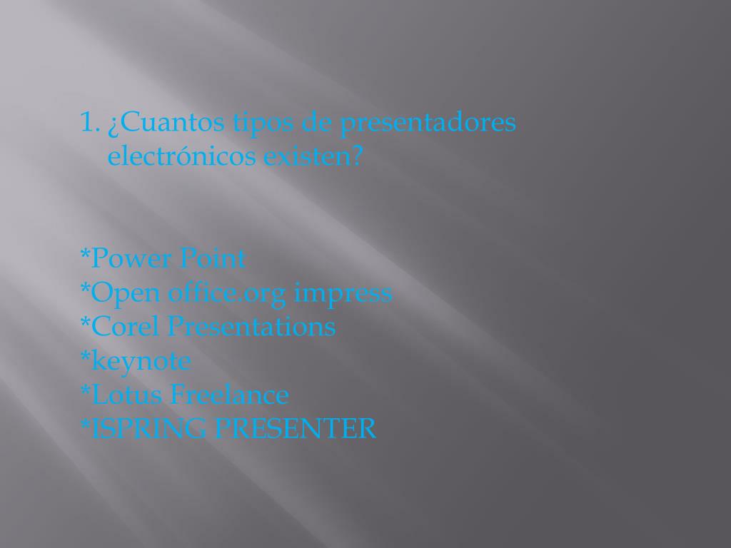 ¿Cuantos tipos de presentadores electrónicos existen? *Power Point *Open office.org impress *Corel Presentations *keynote *Lotus Freelance *ISPRING PRESENTER
