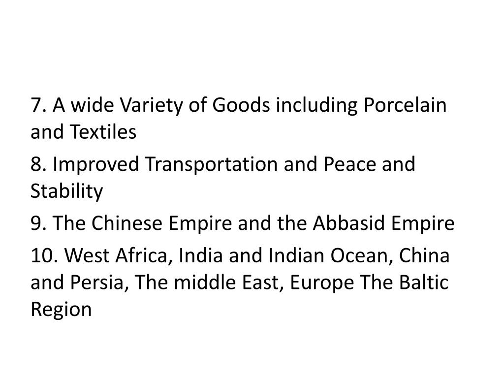 7. A wide Variety of Goods including Porcelain and Textiles 8. Improved Transportation and Peace and Stability 9. The Chinese Empire and the Abbasid Empire 10. West Africa, India and Indian Ocean, China and Persia, The middle East, Europe The Baltic Region