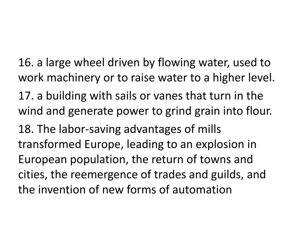 16. a large wheel driven by flowing water, used to work machinery or to raise water to a higher level. 17. a building with sails or vanes that turn in the wind and generate power to grind grain into flour. 18. The labor-saving advantages of mills transformed Europe, leading to an explosion in European population, the return of towns and cities, the reemergence of trades and guilds, and the invention of new forms of automation