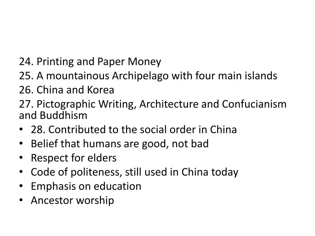 24. Printing and Paper Money 25. A mountainous Archipelago with four main islands 26. China and Korea 27. Pictographic Writing, Architecture and Confucianism and Buddhism • 28. Contributed to the social order in China • Belief that humans are good, not bad • Respect for elders • Code of politeness, still used in China today • Emphasis on education • Ancestor worship