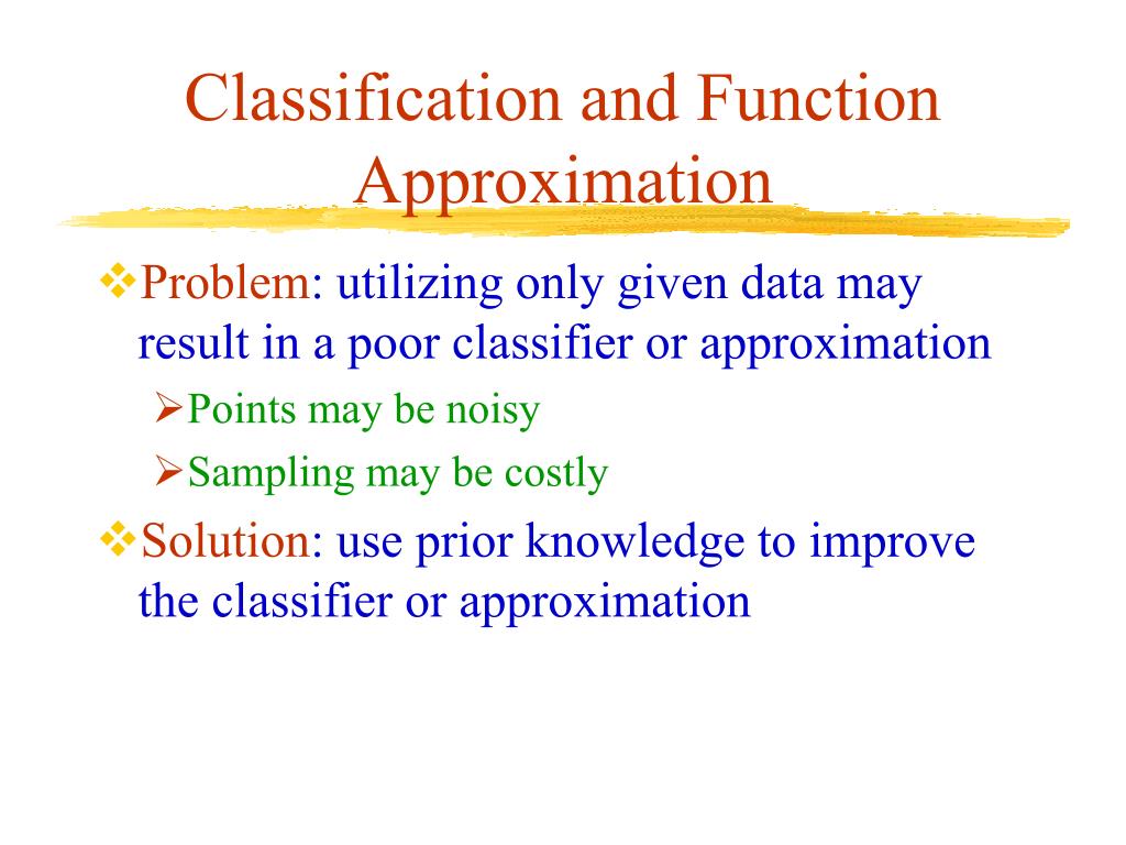 Classification and Function Approximation • Problem: utilizing only given data may result in a poor classifier or approximation • Points may be noisy • Sampling may be costly • Solution: use prior knowledge to improve the classifier or approximation
