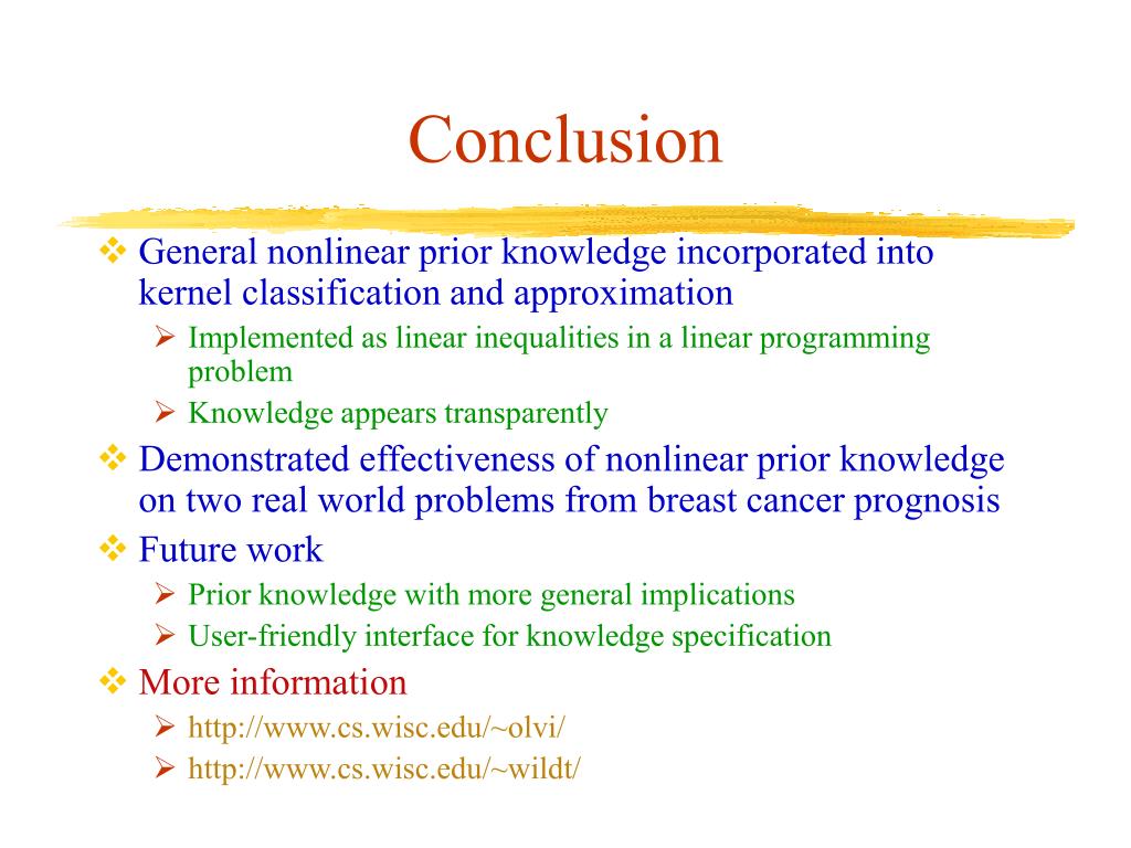 Conclusion • General nonlinear prior knowledge incorporated into kernel classification and approximation • Implemented as linear inequalities in a linear programming problem • Knowledge appears transparently • Demonstrated effectiveness of nonlinear prior knowledge on two real world problems from breast cancer prognosis • Future work • Prior knowledge with more general implications • User-friendly interface for knowledge specification • More information • http://www.cs.wisc.edu/~olvi/ • http://www.cs.wisc.edu/~wildt/