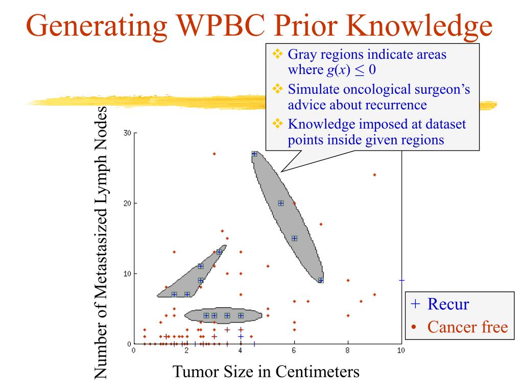 Generating WPBC Prior Knowledge • Gray regions indicate areas where g(x) · 0 • Simulate oncological surgeon’s advice about recurrence • Knowledge imposed at dataset points inside given regions Number of Metastasized Lymph Nodes • Recur • Cancer free Tumor Size in Centimeters