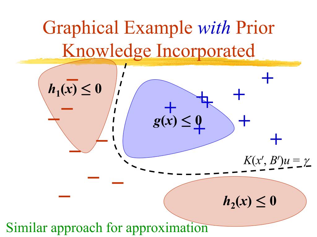 Incorporating Prior Knowledge in Classification (Very Similar) • Implication for positive region • g(x) 0K(x0, B0)u-, 8x2 ½ Rn • 9v ¸0, K(x0, B0)u-- + v0g(x) ¸ 0, 8x2 • Similar implication for negative regions • Add discretized constraints to linear program