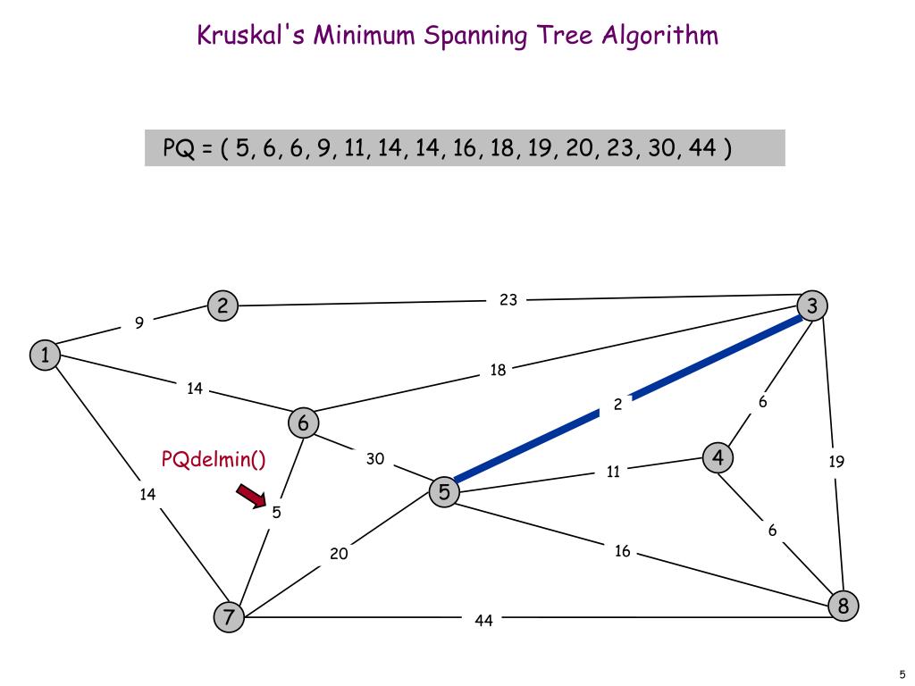 Kruskal's Minimum Spanning Tree Algorithm PQ = ( 14, 14, 16, 18, 19, 20, 23, 30, 44 ) 2 23 3 9 PQdelmin() 1 18 14 6 2 6 4 19 30 11 5 14 5 6 16 20 8 7 44