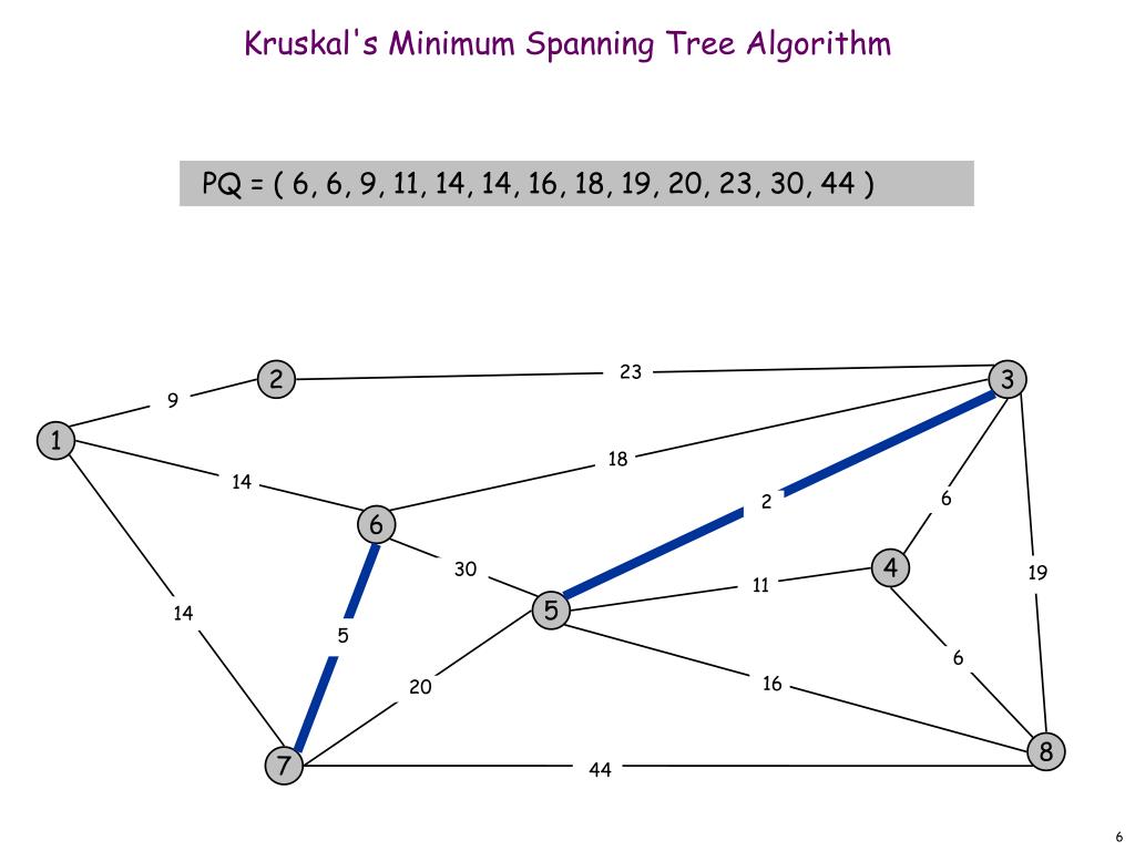 Kruskal's Minimum Spanning Tree Algorithm PQ = ( 2, 5, 6, 6, 9, 11, 14, 14, 16, 18, 19, 20, 23, 30, 44 ) 2 23 3 9 1 18 14 6 2 6 4 19 30 11 5 14 5 6 16 20 8 7 44