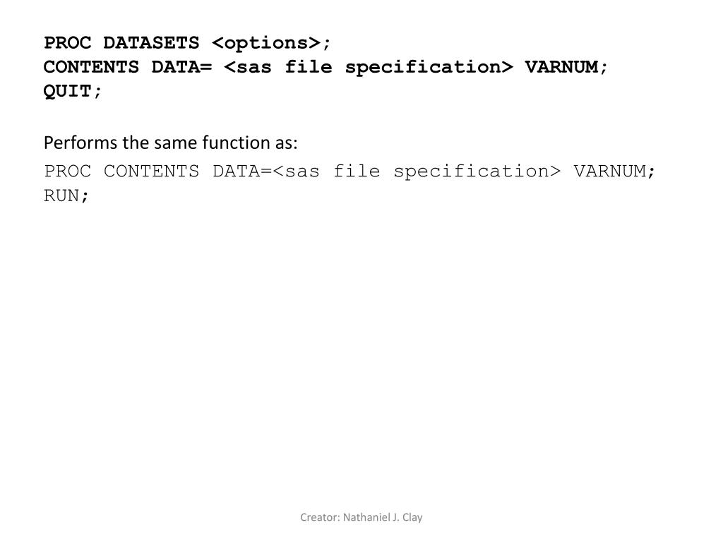 PROC DATASETS <options>;CONTENTS DATA= <sas file specification> VARNUM;QUIT; Performs the same function as: PROC CONTENTS DATA=<sas file specification> VARNUM;RUN; Creator: Nathaniel J. Clay