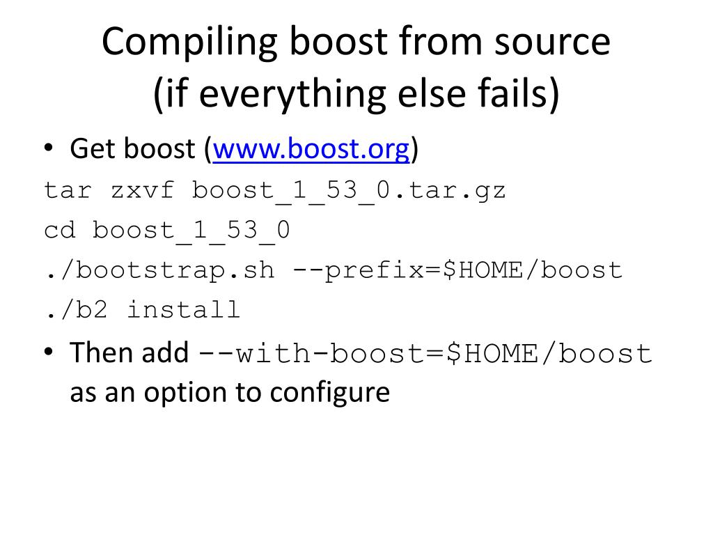 Compiling boost from source(if everything else fails) • Get boost (www.boost.org) tarzxvf boost_1_53_0.tar.gz cd boost_1_53_0 ./bootstrap.sh --prefix=$HOME/boost ./b2 install • Thenadd--with-boost=$HOME/boost as an option toconfigure