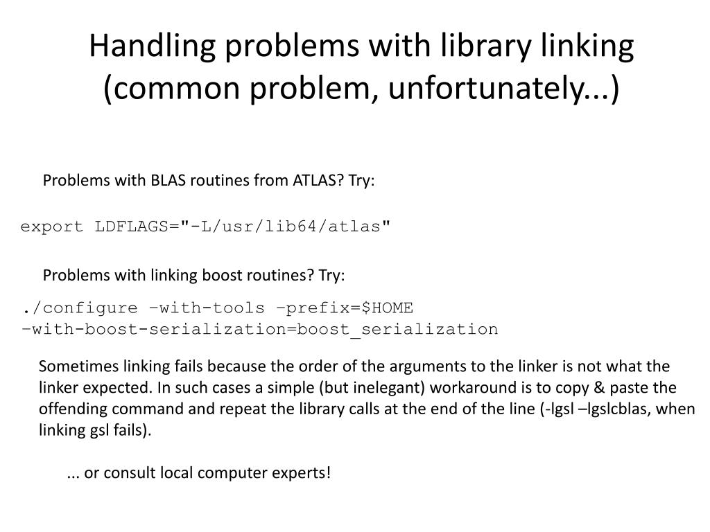 Handling problems with library linking (common problem, unfortunately...) Problems with BLAS routines from ATLAS? Try: export LDFLAGS="-L/usr/lib64/atlas" Problems with linking boost routines? Try: ./configure –with-tools –prefix=$HOME –with-boost-serialization=boost_serialization Sometimes linking fails because the order of the arguments to the linker is not what the linker expected. In such cases a simple (but inelegant) workaround is to copy & paste theoffending command and repeat the library calls at the end of the line (-lgsl –lgslcblas, whenlinking gsl fails). ... or consult local computer experts!