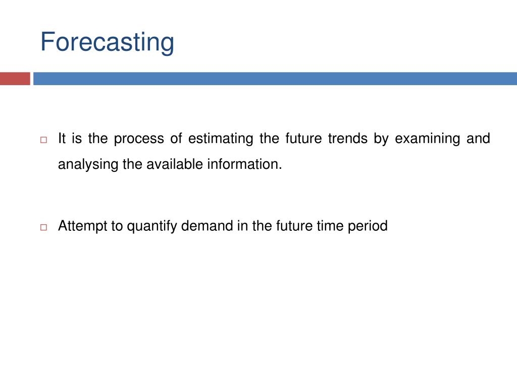 Forecasting • It is the process of estimating the future trends by examining and analysing the available information. • Attempt to quantify demand in the future time period