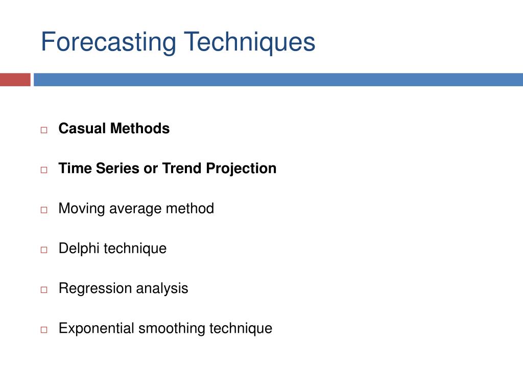 Forecasting Techniques • Casual Methods • Time Series or Trend Projection • Moving average method • Delphi technique • Regression analysis • Exponential smoothing technique