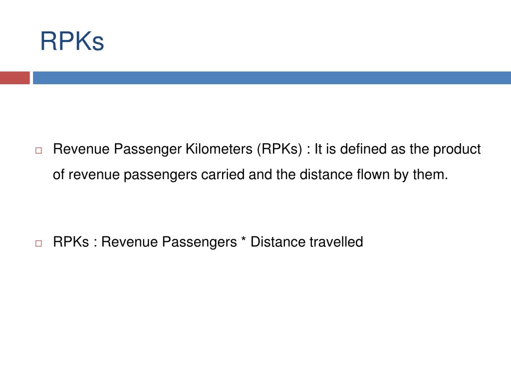 RPKs • Revenue Passenger Kilometers (RPKs) : It is defined as the product of revenue passengers carried and the distance flown by them. • RPKs : Revenue Passengers * Distance travelled