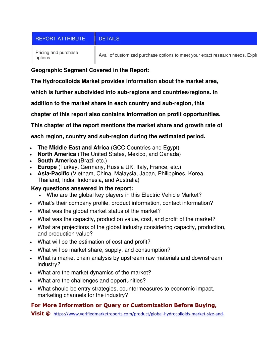 REPORT ATTRIBUTE DETAILS Pricing and purchase options Avail of customized purchase options to meet your exact research needs. Explore purchase options Geographic Segment Covered in the Report: The Hydrocolloids Market provides information about the market area, which is further subdivided into sub-regions and countries/regions. In addition to the market share in each country and sub-region, this chapter of this report also contains information on profit opportunities. This chapter of the report mentions the market share and growth rate of each region, country and sub-region during the estimated period. •The Middle East and Africa (GCC Countries and Egypt) •North America (The United States, Mexico, and Canada) •South America (Brazil etc.) •Europe (Turkey, Germany, Russia UK, Italy, France, etc.) •Asia-Pacific (Vietnam, China, Malaysia, Japan, Philippines, Korea, Thailand, India, Indonesia, and Australia) Key questions answered in the report: •Who are the global key players in this Electric Vehicle Market? •What’s their company profile, product information, contact information? •What was the global market status of the market? •What was the capacity, production value, cost, and profit of the market? •What are projections of the global industry considering capacity, production, and production value? •What will be the estimation of cost and profit? •What will be market share, supply, and consumption? •What is market chain analysis by upstream raw materials and downstream industry? •What are the market dynamics of the market? •What are the challenges and opportunities? •What should be entry strategies, countermeasures to economic impact, marketing channels for the industry? For More Information or Query or Customization Before Buying, Visit @ https://www.verifiedmarketreports.com/product/global-hydrocolloids-market-size-and-