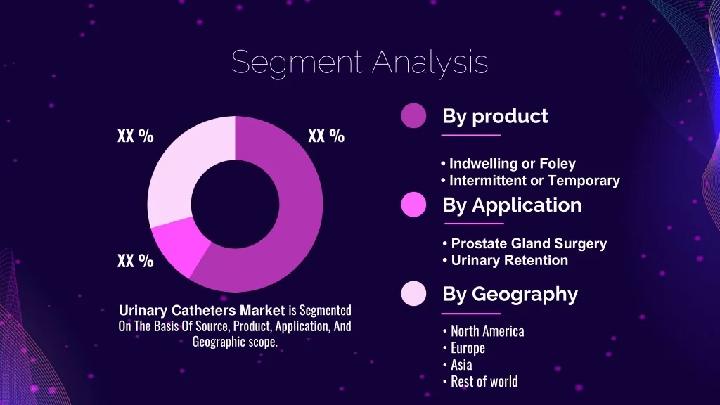 Segment Analysis • By product XX % XX % • • Indwelling or Foley • • Intermittent or Temporary • By Application • • Prostate Gland Surgery • • Urinary Retention XX % • By Geography • Urinary Catheters Market is Segmented On The Basis Of Source, Product, Application, And Geographic scope. • • North America • • Europe • • Asia • • Rest of world