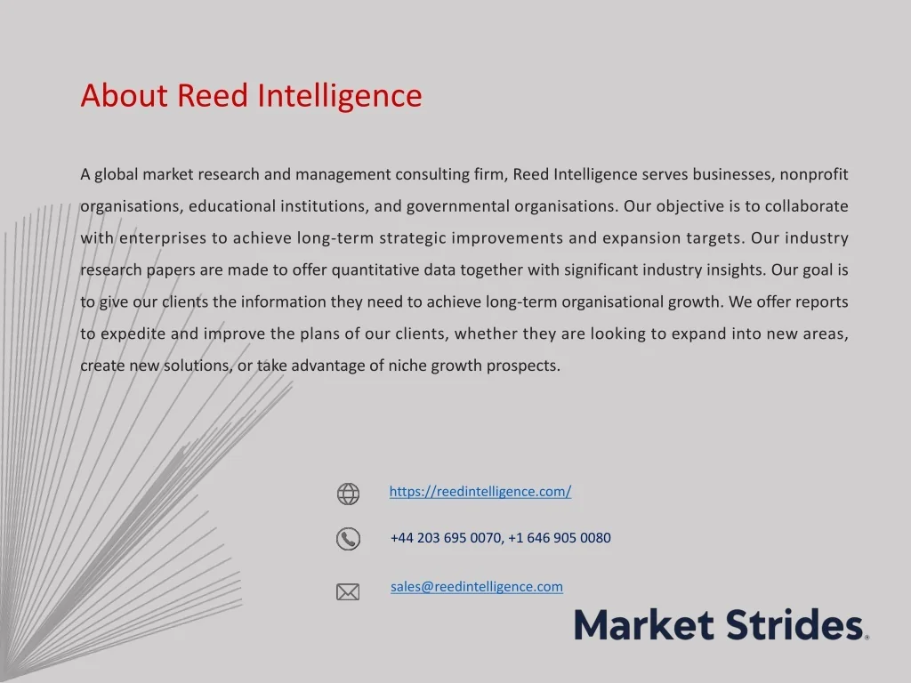 About Reed Intelligence A global market research and management consulting firm, Reed Intelligence serves businesses, nonprofit organisations, educational institutions, and governmental organisations. Our objective is to collaborate with enterprises to achieve long-term strategic improvements and expansion targets. Our industry research papers are made to offer quantitative data together with significant industry insights. Our goal is to give our clients the information they need to achieve long-term organisational growth. We offer reports to expedite and improve the plans of our clients, whether they are looking to expand into new areas, create new solutions, or take advantage of niche growth prospects. https://reedintelligence.com/ +44 203 695 0070, +1 646 905 0080 sales@reedintelligence.com