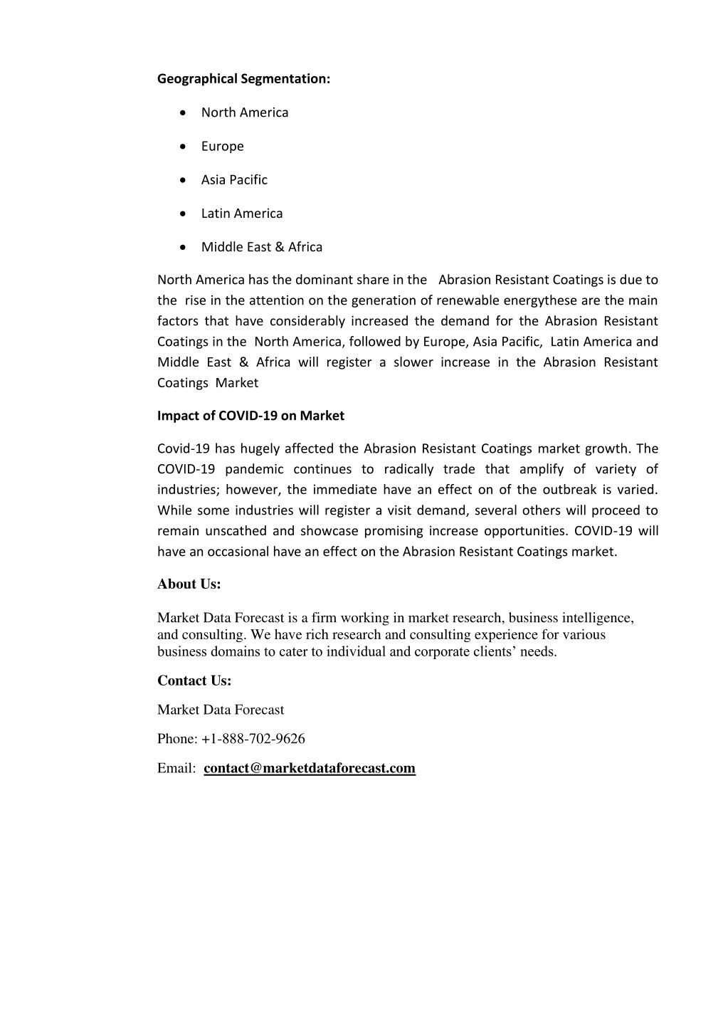 Geographical Segmentation: •North America •Europe •Asia Pacific •Latin America •Middle East & Africa North America has the dominant share in the Abrasion Resistant Coatings is due to the rise in the attention on the generation of renewable energythese are the main factors that have considerably increased the demand for the Abrasion Resistant Coatings in the North America, followed by Europe, Asia Pacific, Latin America and Middle East & Africa will register a slower increase in the Abrasion Resistant Coatings Market Impact of COVID-19 on Market Covid-19 has hugely affected the Abrasion Resistant Coatingsmarket growth. The COVID-19 pandemic continues to radically trade that amplify of variety of industries; however, the immediate have an effect on of the outbreak is varied. While some industries will register a visit demand, several others will proceed to remain unscathed and showcase promising increase opportunities. COVID-19 will have an occasional have an effect on the Abrasion Resistant Coatings market. About Us: Market Data Forecast is a firm working in market research, business intelligence, and consulting. We have rich research and consulting experience for various business domains to cater to individual and corporate clients’ needs. Contact Us: Market Data Forecast Phone: +1-888-702-9626 Email: contact@marketdataforecast.com