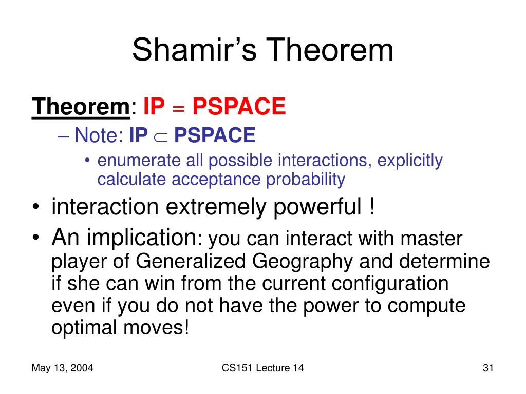 Shamir’s Theorem Theorem: IP = PSPACE • Note: IP PSPACE • enumerate all possible interactions, explicitly calculate acceptance probability • interaction extremely powerful ! • An implication: you can interact with master player of Generalized Geography and determine if she can win from the current configuration even if you do not have the power to compute optimal moves! CS151 Lecture 14