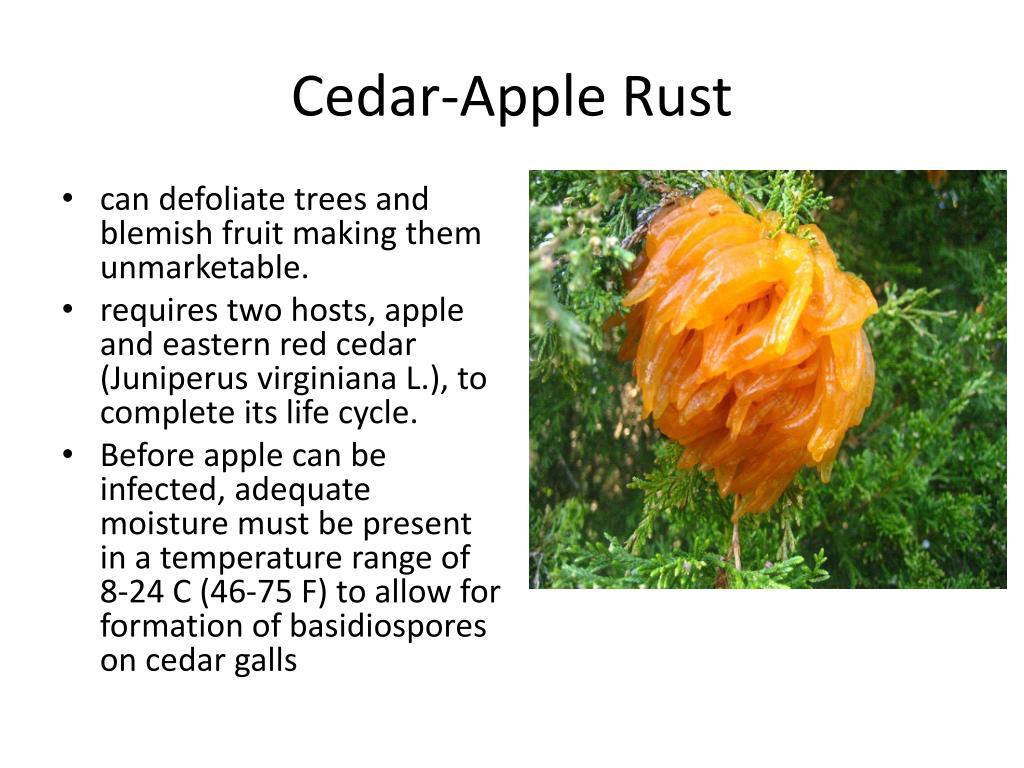 Cedar-Apple Rust • can defoliate trees and blemish fruit making them unmarketable. • requires two hosts, apple and eastern red cedar (Juniperusvirginiana L.), to complete its life cycle. • Before apple can be infected, adequate moisture must be present in a temperature range of 8-24 C (46-75 F) to allow for formation of basidiospores on cedar galls