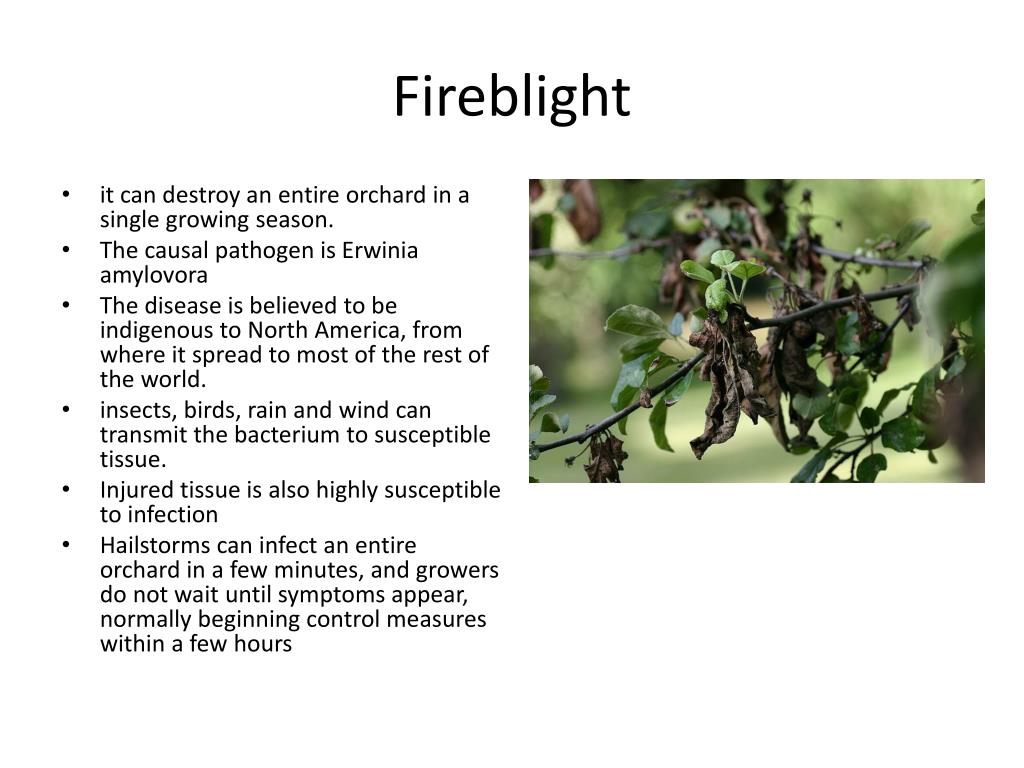 Fireblight • it can destroy an entire orchard in a single growing season. • The causal pathogen is Erwiniaamylovora • The disease is believed to be indigenous to North America, from where it spread to most of the rest of the world. • insects, birds, rain and wind can transmit the bacterium to susceptible tissue. • Injured tissue is also highly susceptible to infection • Hailstorms can infect an entire orchard in a few minutes, and growers do not wait until symptoms appear, normally beginning control measures within a few hours