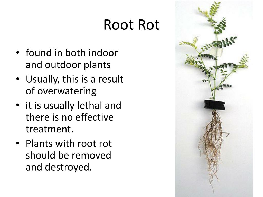 Root Rot • found in both indoor and outdoor plants • Usually, this is a result of overwatering • it is usually lethal and there is no effective treatment. • Plants with root rot should be removed and destroyed.