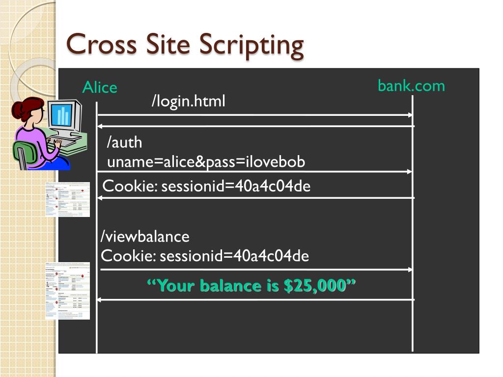 /login.html /authuname=alice&pass=ilovebob Cookie: sessionid=40a4c04de Cross Site Scripting bank.com Alice /viewbalanceCookie: sessionid=40a4c04de “Your balance is $25,000”