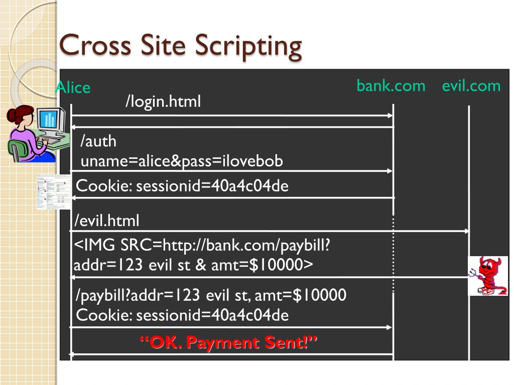 /login.html /authuname=alice&pass=ilovebob Cookie: sessionid=40a4c04de /evil.html <IMG SRC=http://bank.com/paybill?addr=123 evil st & amt=$10000> /paybill?addr=123 evil st, amt=$10000Cookie: sessionid=40a4c04de “OK. Payment Sent!” Cross Site Scripting bank.com evil.com Alice
