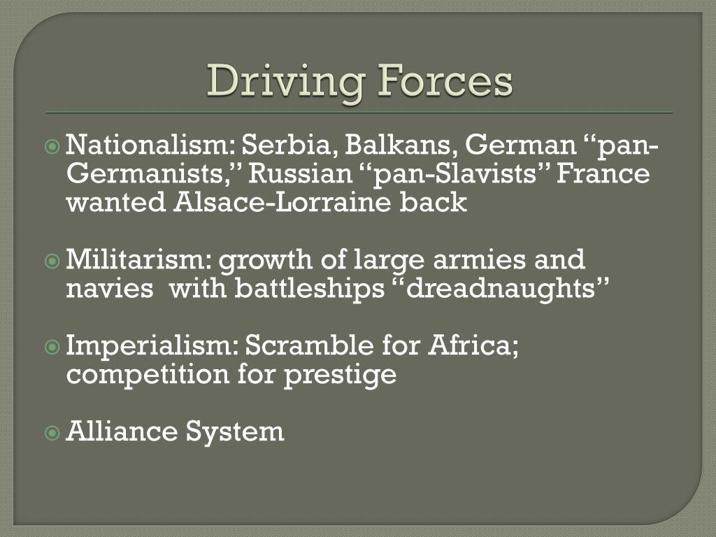 Driving Forces Nationalism: Serbia, Balkans, German “pan-Germanists,” Russian “pan-Slavists” France wanted Alsace-Lorraine back Militarism: growth of large armies and navies with battleships “dreadnaughts” Imperialism: Scramble for Africa; competition for prestige Alliance System