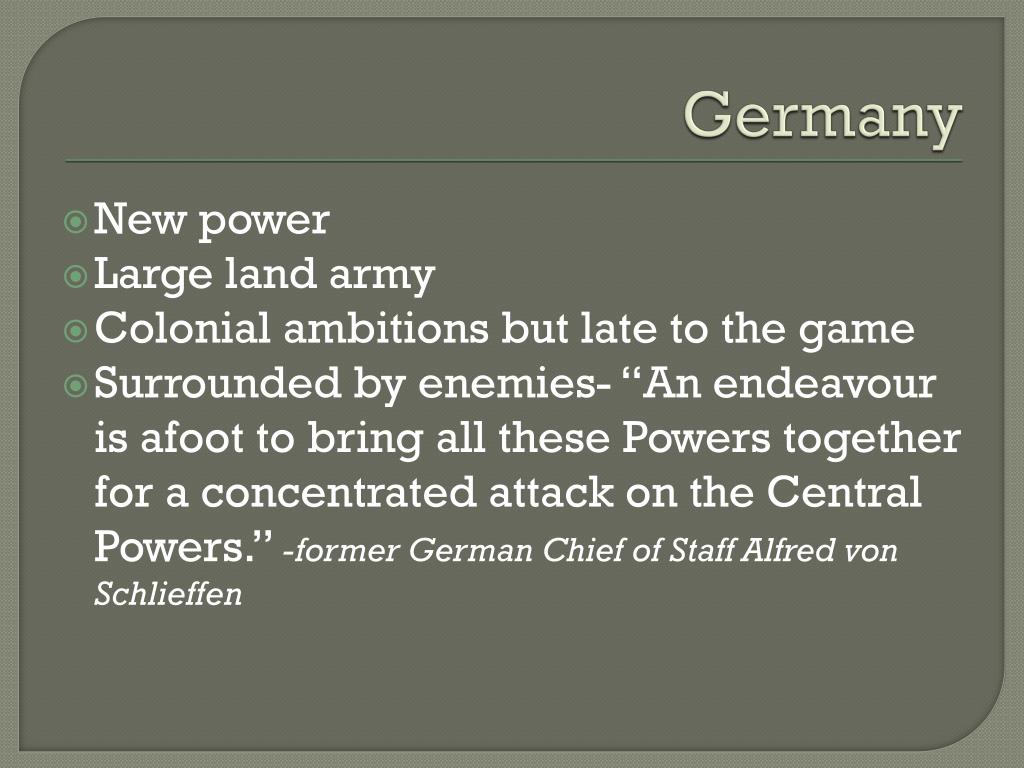 Germany New power Large land army Colonial ambitions but late to the game Surrounded by enemies- “An endeavour is afoot to bring all these Powers together for a concentrated attack on the Central Powers.” -former German Chief of Staff Alfred von Schlieffen