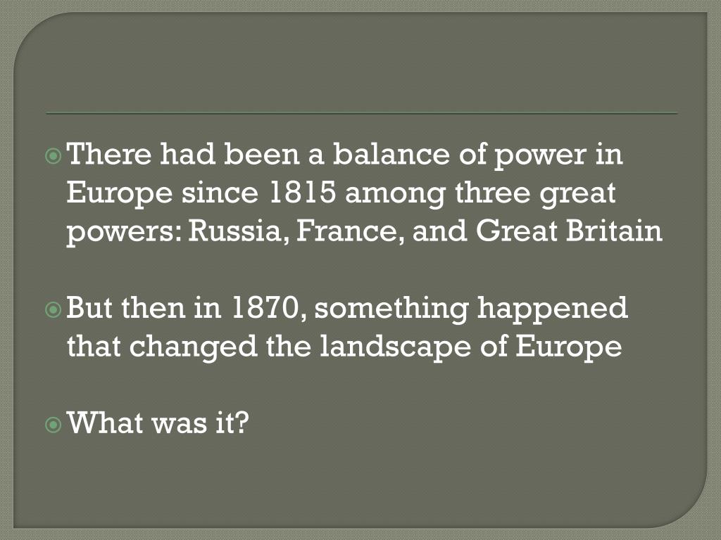There had been a balance of power in Europe since 1815 among three great powers: Russia, France, and Great Britain But then in 1870, something happened that changed the landscape of Europe What was it?