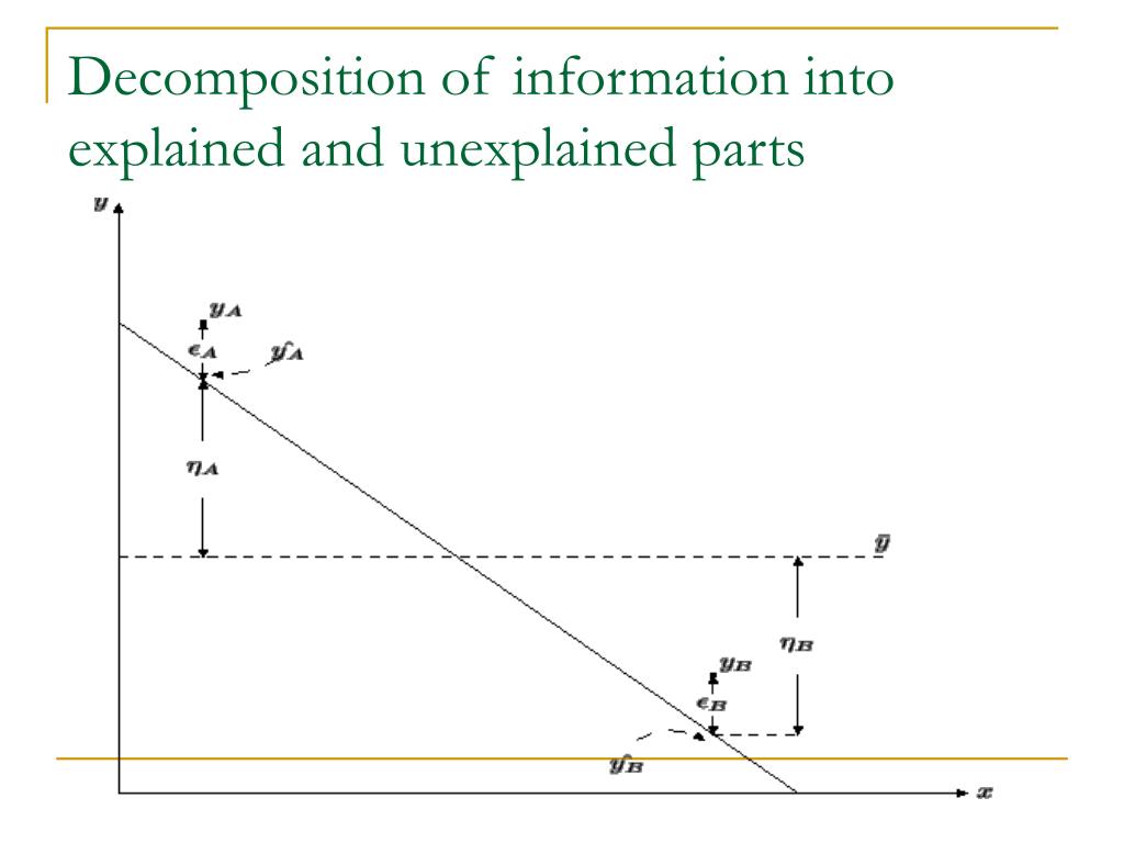 Variance “Candy Bar” Explained Unexplained • The R-sq value: estimates the percentage of variation explained by a linear relationship with the independent or explanatory variable. Unless this estimate is 100% (or very near), it is not sufficient on its own. • The amounts of explained and unexplained information due to the model are measured by Sums of Squares