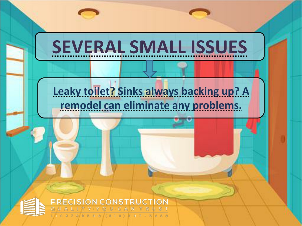 SEVERAL SMALL ISSUES Leaky toilet? Sinks always backing up? A remodel can eliminate any problems.