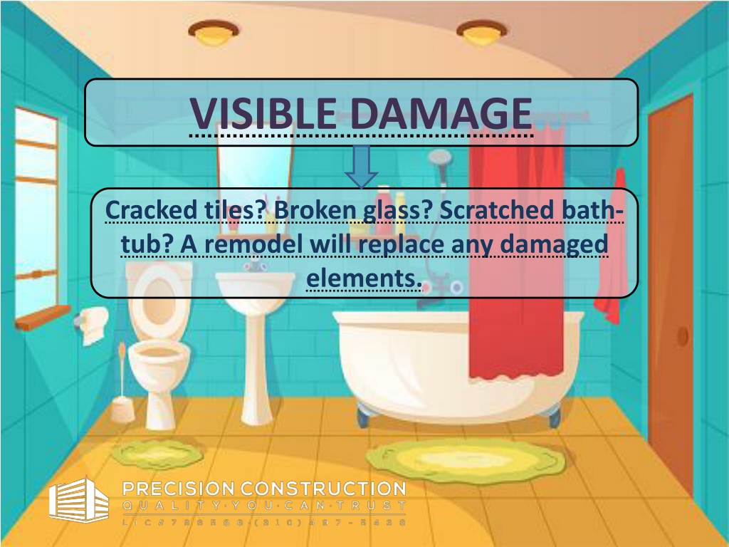 VISIBLE DAMAGE Cracked tiles? Broken glass? Scratched bath- tub? A remodel will replace any damaged elements.