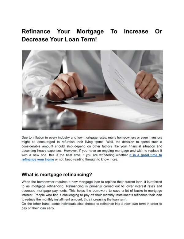 Refinance Decrease Your Loan Term! Your Mortgage To Increase Or Due to inflation in every industry and low mortgage rates, many homeowners or even investors might be encouraged to refurbish their living space. Well, the decision to spend such a considerable amount should also depend on other factors like your financial situation and upcoming heavy expenses. However, if you have an ongoing mortgage and wish to replace it with a new one, this is the best time. If you are wondering whether it is a good time to refinance your home or not, keep reading through to know more. What is mortgage refinancing? When the homeowner requires a new mortgage loan to replace their current loan, it is referred to as mortgage refinancing. Refinancing is primarily carried out to lower interest rates and decrease mortgage payments. This helps the borrowers to save a lot of bucks in mortgage interest. People who find it challenging to pay off their monthly installments refinance their loan to reduce the monthly installment amount, thus increasing the loan term. On the other hand, some individuals also choose to refinance into a new loan term in order to pay off their loan early.