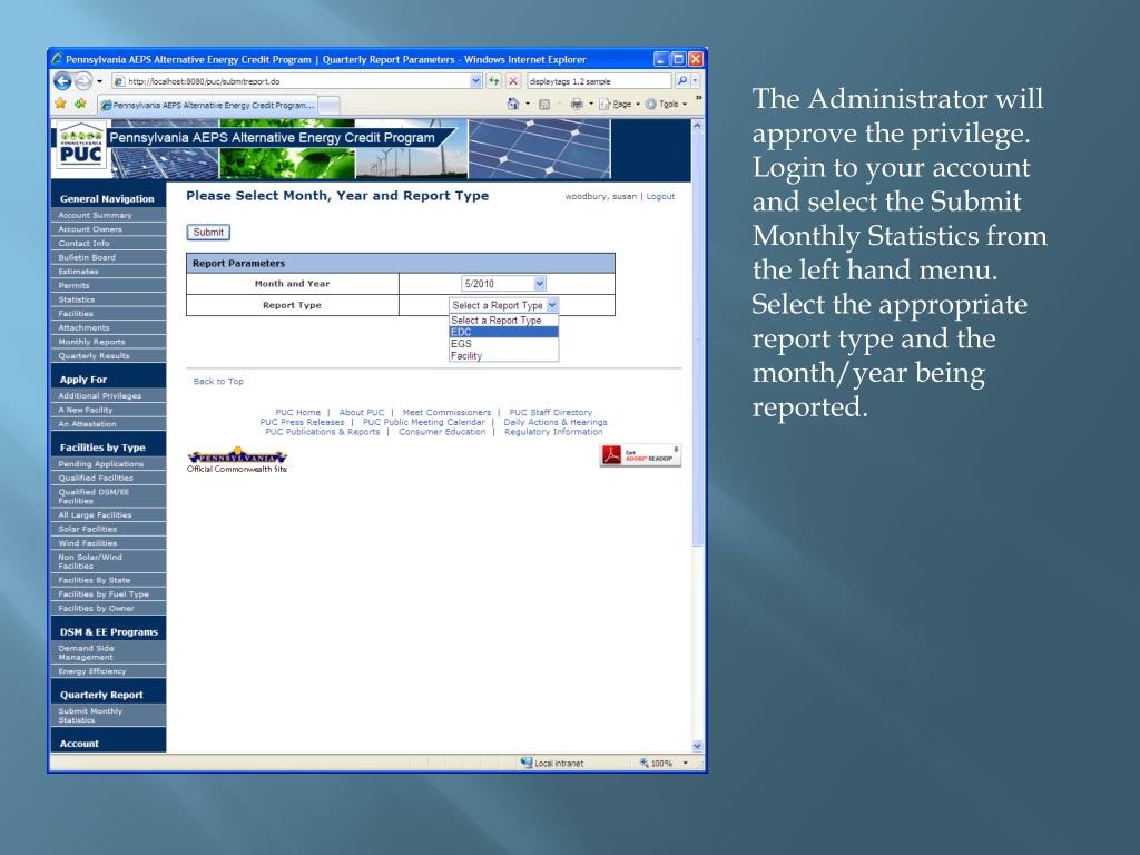 The Administrator will approve the privilege. Login to your account and select the Submit Monthly Statistics from the left hand menu. Select the appropriate report type and the month/year being reported.